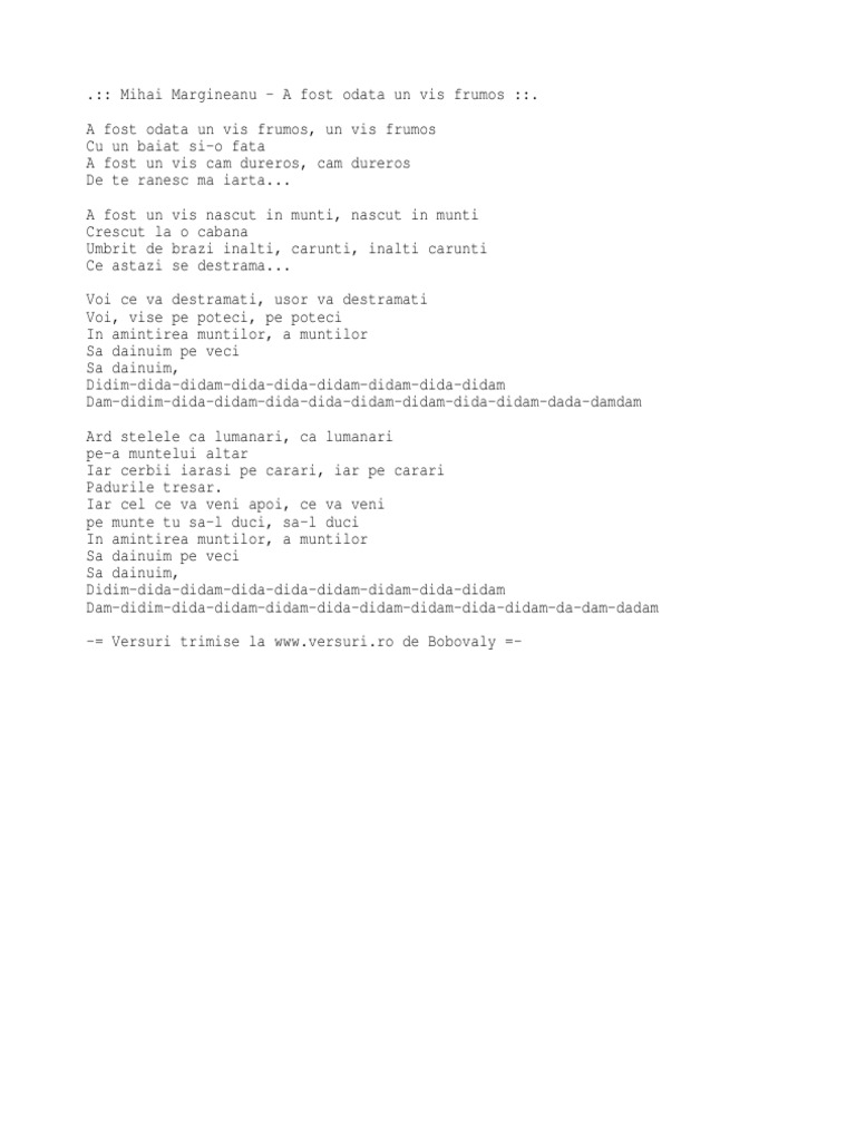 A fost odata un vis frumos. A fost un vis nascut in munti nascut in munti crescut la o cabana umbrit de brazi inalti carunti inalti carunti ce astazi se destrama. 50 videos play all mix visul a fost odată un vis frumos cu versuri youtube mircea vintila cantec de leagan pentru toata copilaria duration. A fost odata un vis frumos un vis frumos cu un baiat si o fata a fost un vis cam dureros cam dureros de te ranesc ma iarta. Voi ce va destramati usor va destramati voi vise pe poteci pe poteci.