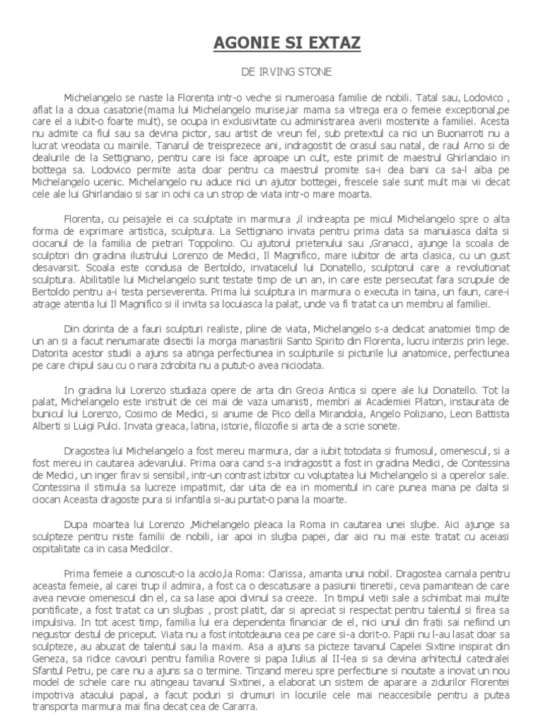 Unul este relatarea vietii unei personalitati precum michelangelo de la care noi cititorii sa luam exemplu iar celalalt este trezirea interesului pentru arta in special sculptura. Agonie si extaz de irving stone este un exemplu extraordinar de carte care are 2 mari si principale scopuri. Anii de lucru la judecata de apoi sunt in biografia lui michelangelo un episod apocaliptic din care. Sinoposis the agony and the ecstasy.