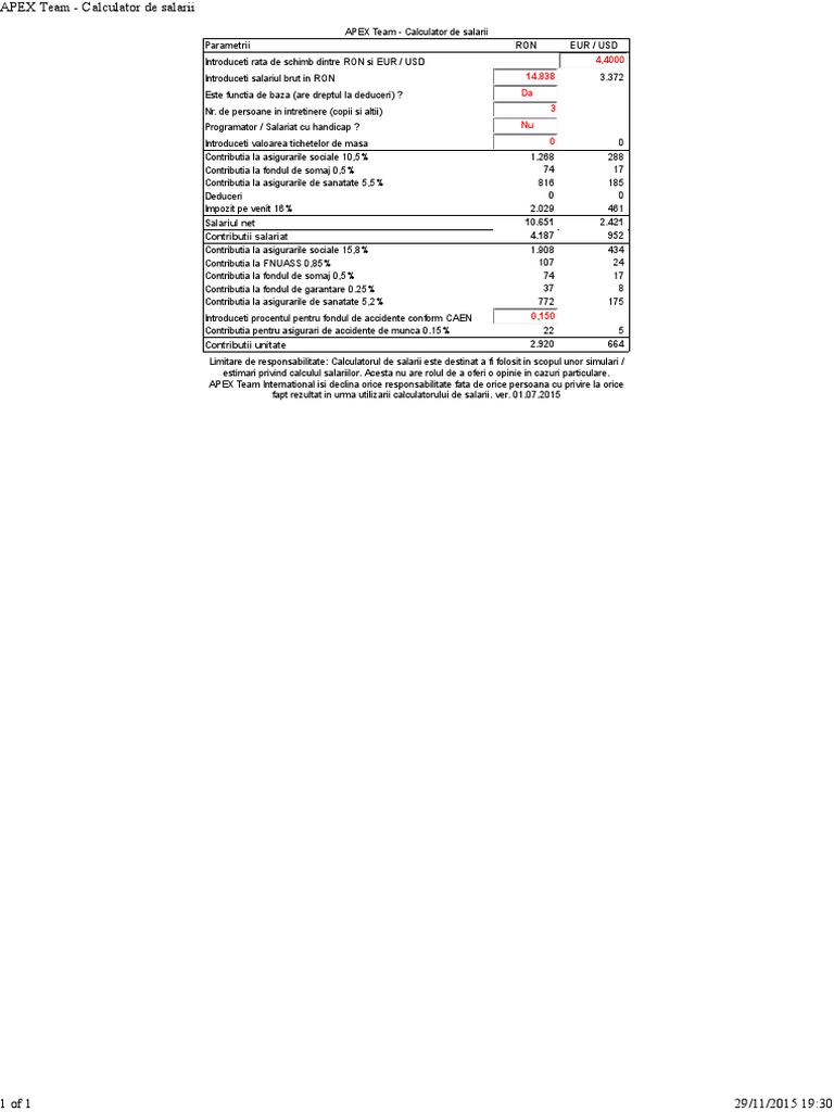 Consultanţii noştrii au o bogatã experienţă având clienti internationali din diferite domenii. 01 oct 2010 30 iun 2013 0 04 01 iul 2013 28 feb 2014 0 02 pe zi 0 04 01 mar 2014 31 dec 2015 0 02 pe zi 0 03 01 ian 2016 0 01 pe zi 0 02 ver. In aceasta pagina aveti posibilitatea de a va calcula salariul brut pornind fie de la cel net fie de la cel complet cost total firma. 30 01 2018 the browser does not support javascript.