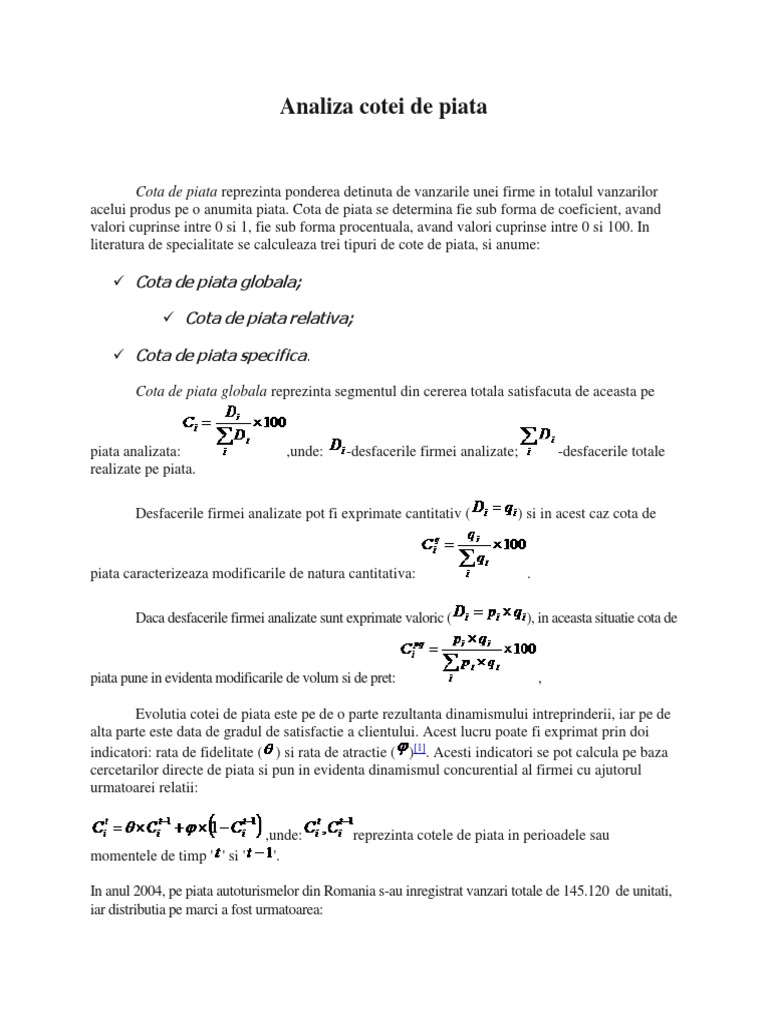 2010 panta ro an. Deseori termenul cota de piata se foloseste cu sensul de cota de vanzari. Reprezinta raportul neprocentual dintre cota sa de piata si cea a celui mai puternic concurent. In cazul liderului de piata cota de piata relativa se determina in functie de volumul vanzarilor urmatorului cel mai puternic concurent si este intotdeauna supraunitara pe piata romaneasca de produse cosmetice s au inregistrat in anul 2003 vanzari totale in valoare de 288 milioane euro cifra in care sunt incluse si importurile de marfuri care se ridica la 96 milioane euro.