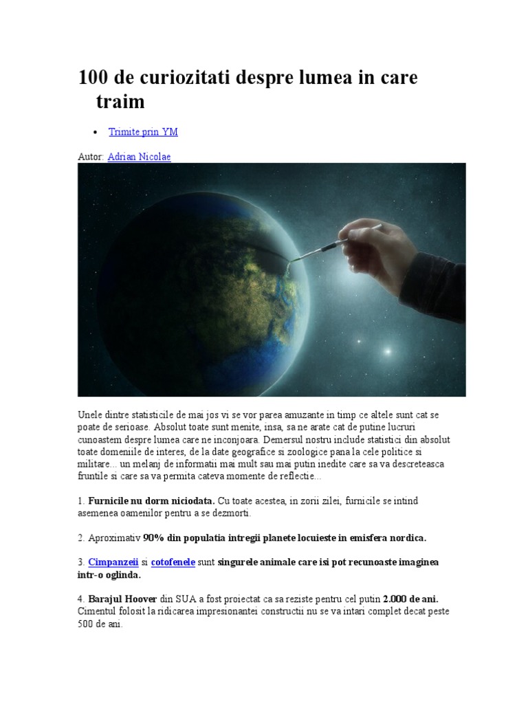 Curiozitati din toata lumea. Curiozitati despre animale din toata lumea o girafa poate sa si curete urechile cu limba de 21 de inch peste 50 cm un grup de broaste este numit o armata ochiul strutului este mai mare decat creierul sau pisicile pot sari de 7 ori lungimea cozii lor scorpionii stralucesc radiaza la lumina ultra violeta cele mai citite. Stiti cate emailuri se trimit zilnic in toata lumea. în imponderabilitate un bob de mazăre congelată va exploda în cazul în care vine în contact cu pepsi. Creativitatea fără margini a omului a dat naştere dintoteauna unor monumente deosebite.